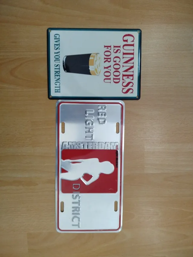 Detalles del productoLote de dos chapas decorativas, una de Guinness y otra del Red Light District de Ámsterdam. Perfectas para coleccionistas o para dar un toque personal a cualquier espacio.