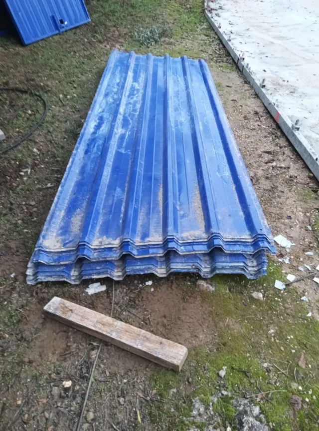 Detalles del productoConjunto de chapas metálicas de color azul, ideales para cubiertas o cerramientos.