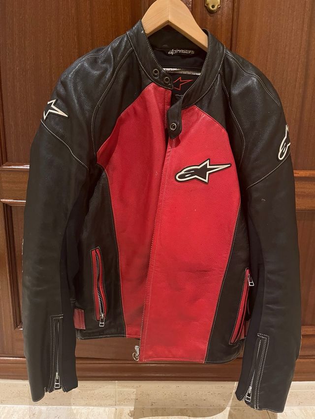 Chaqueta de moto de cuero Alpinestars, en rojo y negro. Está en buen estado. - Marca: Alpinestars - Material: Cuero - Colores: Rojo y negro