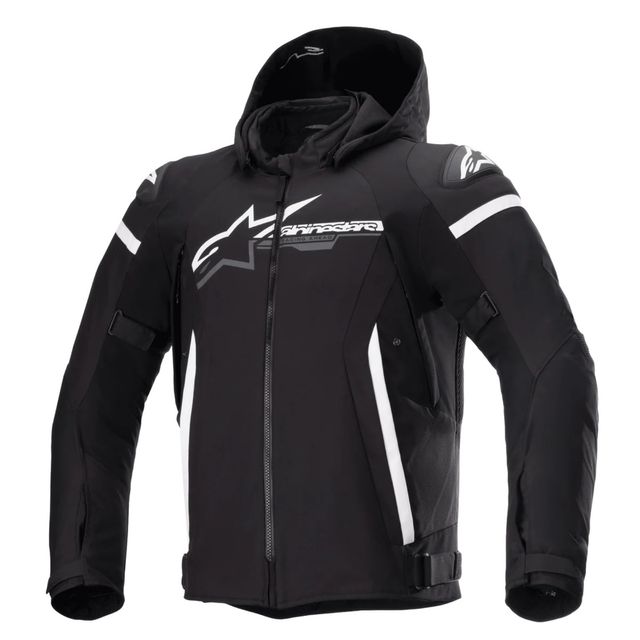 Chaqueta de moto Alpinestars ZACA con capucha. - Diseño en color negro con detalles blancos. - Logo de Alpinestars en blanco y gris. - Talla L