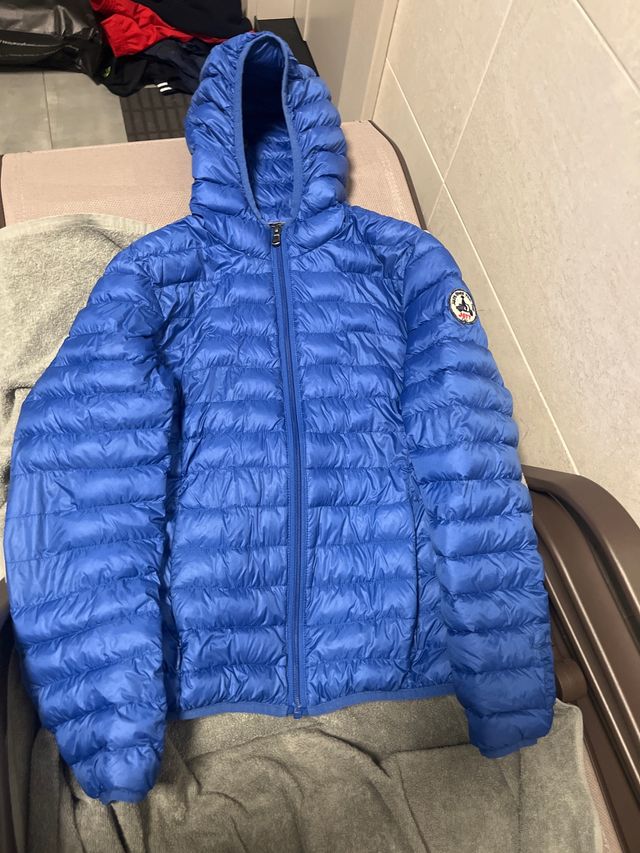Chaqueta acolchada de color azul brillante, con capucha integrada y cierre de cremallera. - Diseño ligero y cálido. - Detalle de logo en la manga.