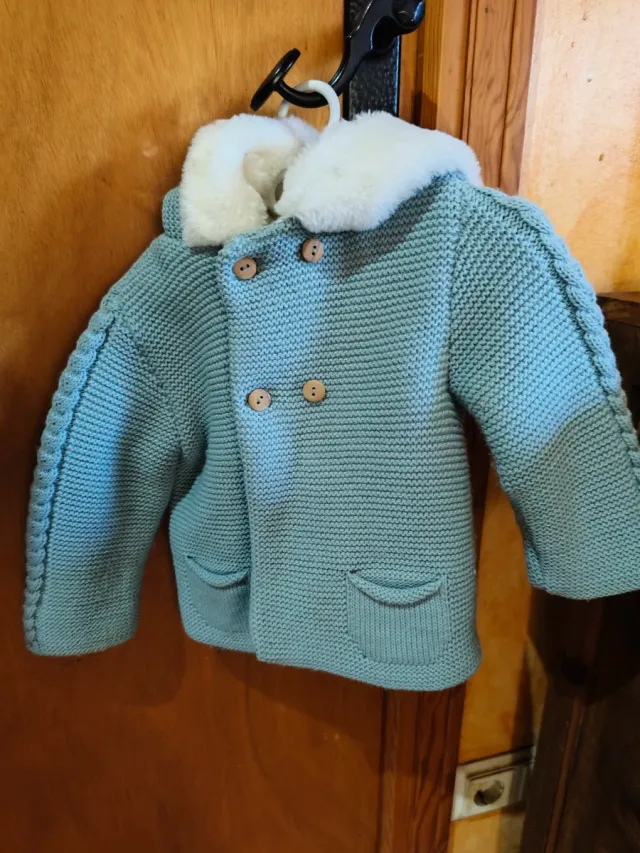 Detalles del productoChaqueta de bebé de punto en color azul claro, ideal para los días más fríos. Cuenta con un suave forro interior de borreguito blanco en la capucha y el cuello para mayor calidez.
