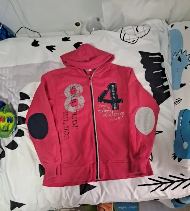 Chaqueta de color roja con cremallera y capucha. - Detalle de número 84 en la parte delantera. - Parches en los codos. - Estampado Young riders academy.