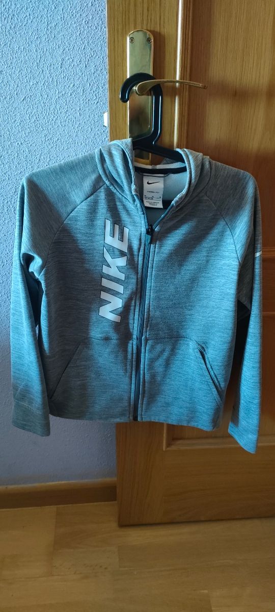 Detalles del productoChaqueta de chándal con capucha para niño de la marca Nike. Es de color gris. Los puños tienen la forma para poder meter la mano. Está en muy buen estado. Es la talla M (137-147 cm). Más ropa en mi perfil.
