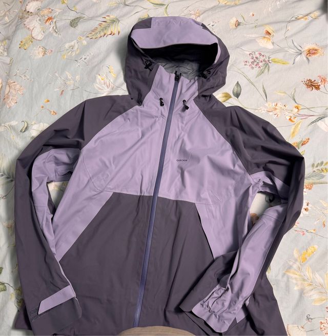 Detalles del productoChaqueta cortavientos de la marca Quechua, ideal para actividades al aire libre. Diseño bicolor en tonos morado y gris. Solo utilizada una vez.