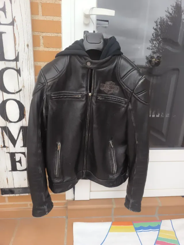 Cazadora,chupa,de cuero negra para hombre de la marca Harley Davidson. Diseño clásico con capucha.