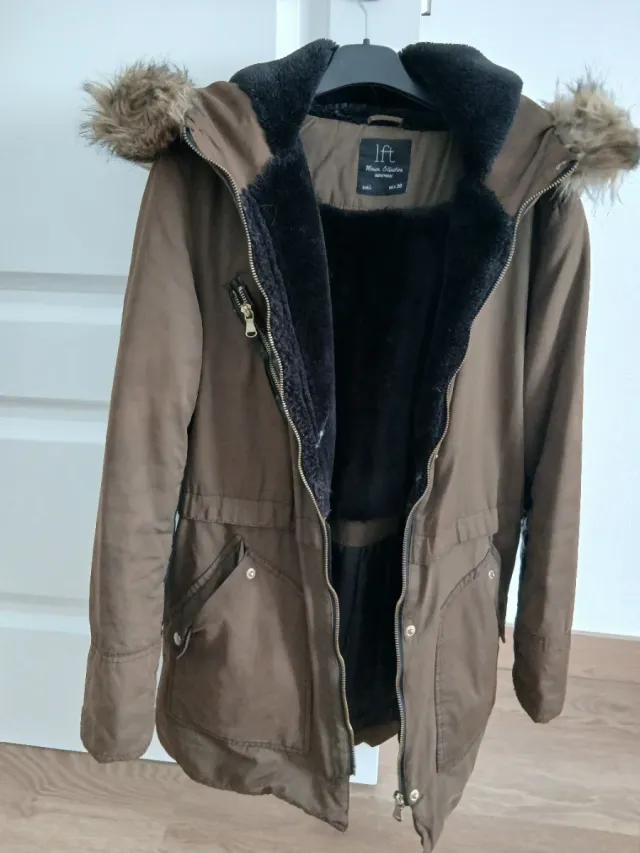 Chaqueta estilo parka con forro interior de pelo sintético y capucha con pelo. - Cierre de cremallera.