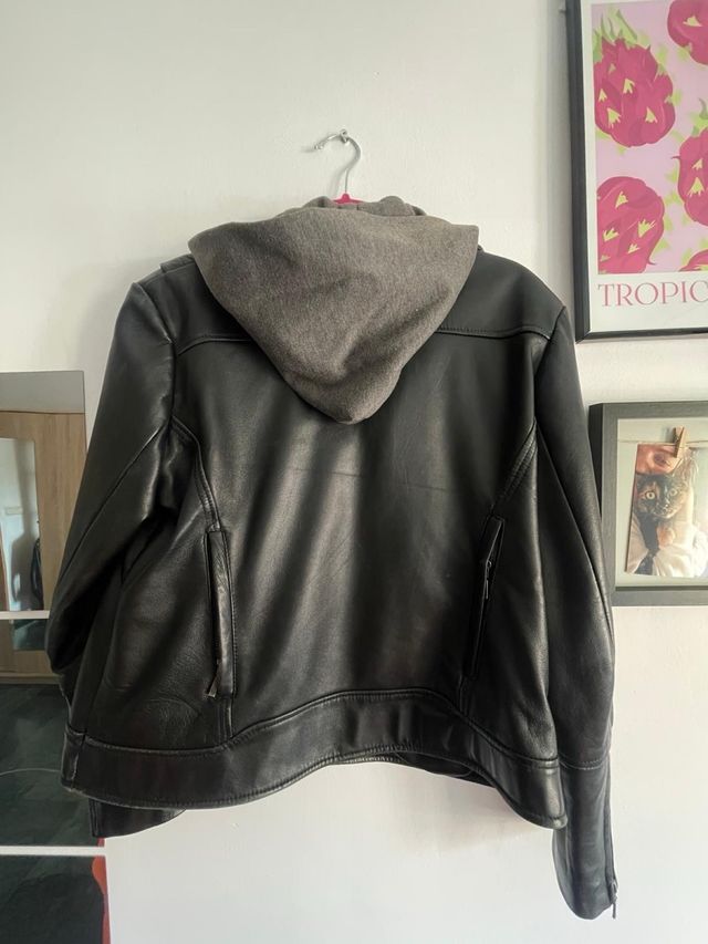 Chaqueta de cuero negra con capucha gris.