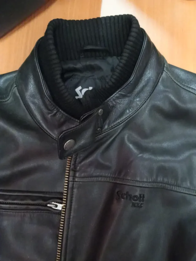 Chaqueta de cuero negra de la marca Schott. - Cuello alto con acabado acanalado. - Cierre de cremallera frontal. - Bolsillo con cremallera en el pecho.