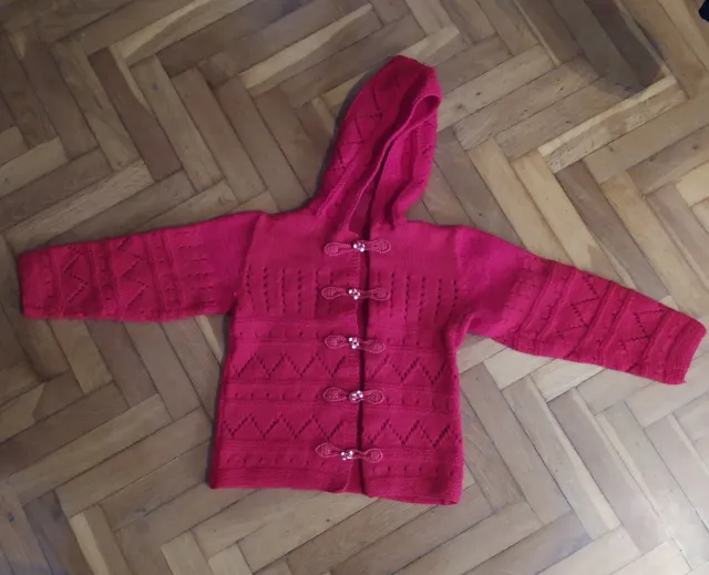 Detalles del productoChaqueta de lana tejida a mano en color rojo, ideal para mantener abrigado.