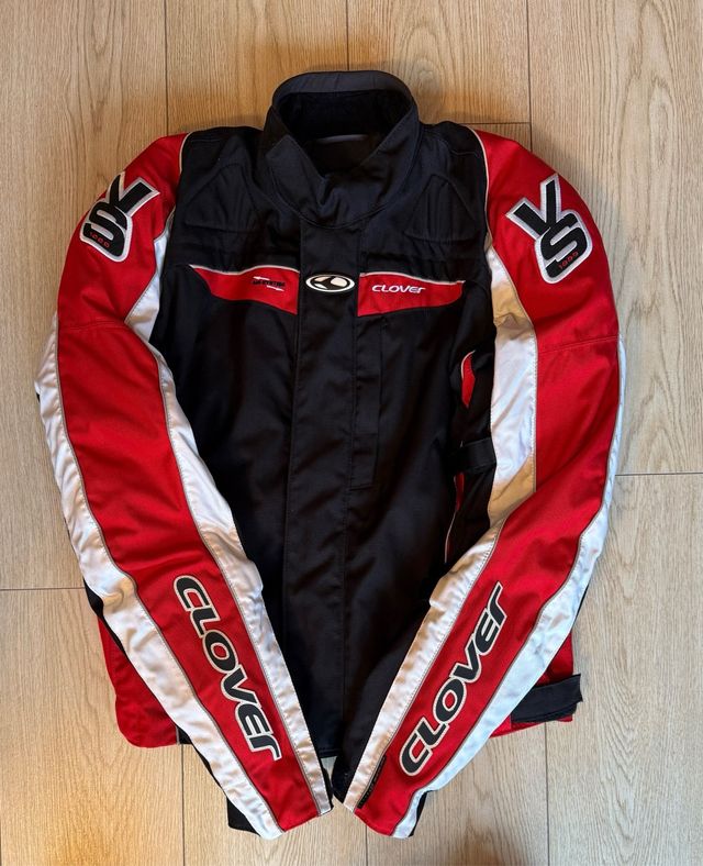 Chaqueta de moto Clover en negro, rojo y blanco.