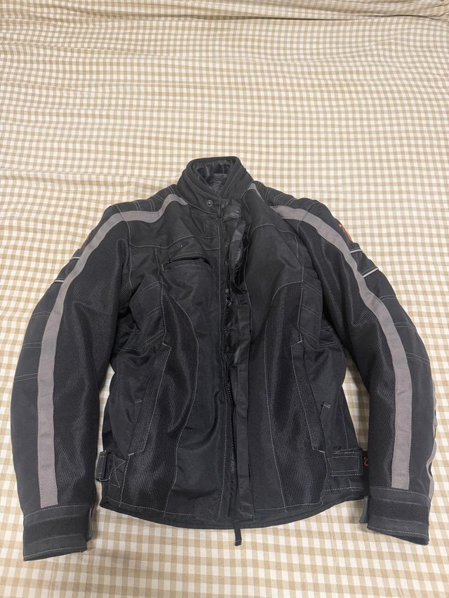 Detalles del productoChaqueta de moto de malla negra con detalles grises.