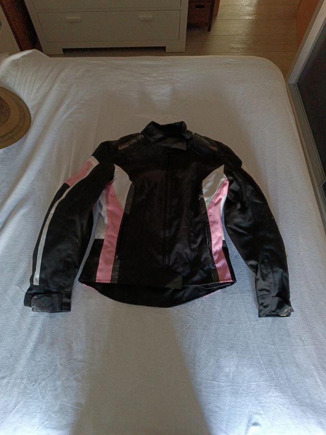 Cordura. Protecciones en codos, hombros y espalda. No lleva teja.