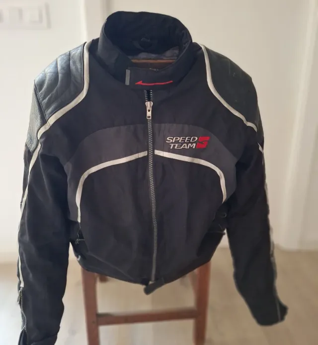 Mezcla de textil resistente y piel auténtica en hombros y codos. Muy cómoda, con protecciones internas y cremalleras funcionales.