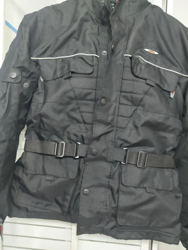 Detalles del productoChaqueta de moto negra con múltiples bolsillos y cinturón ajustable.