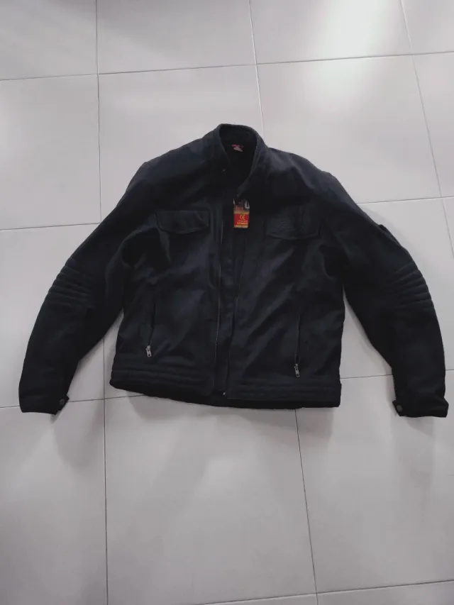 Chaqueta de moto de color negro, ideal para protegerte en tus rutas. - Diseño con cuello alto. - Cierre de cremallera frontal. - Bolsillos con cremallera.