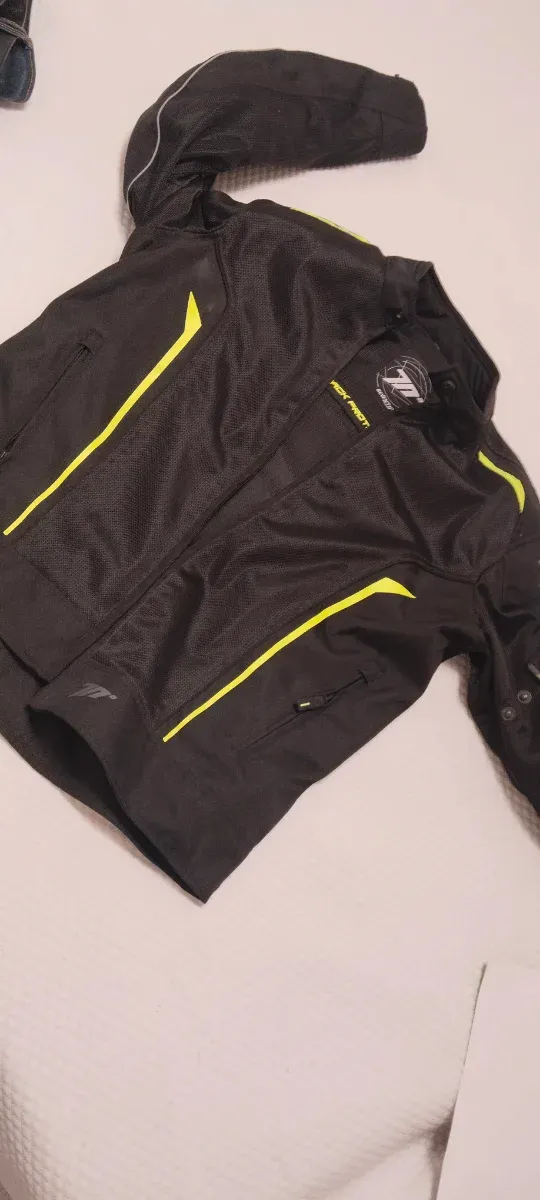 Detalles del productoChaqueta de moto negra con detalles llamativos en color neón.