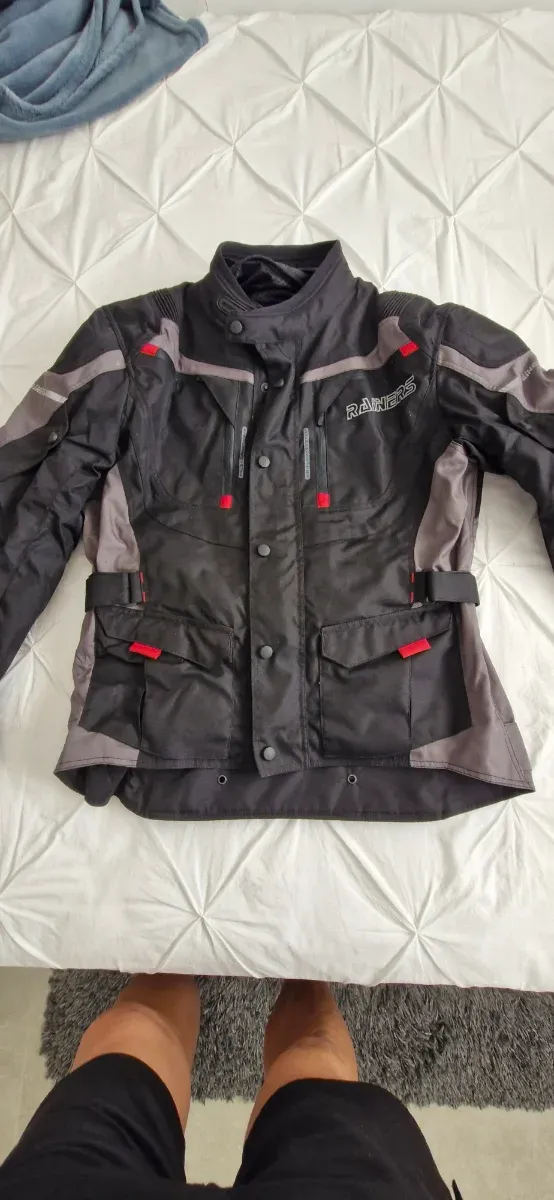 Detalles del productoChaqueta de moto con detalles en rojo y gris. Diseñada para ofrecer comodidad y protección.