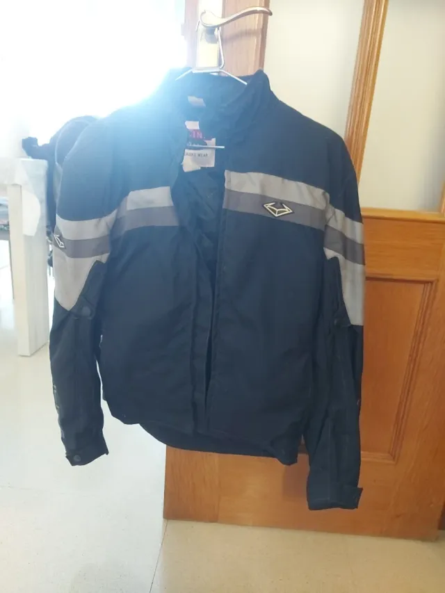 Chaqueta de moto con diseño moderno y detalles reflectantes. - Color principal negro. - Rayas grises en mangas y pecho. - Cuello alto. - Cierre frontal con cremallera.