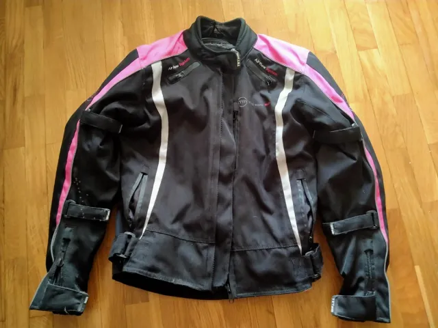 Detalles del productoChaqueta de moto con detalles en rosa y blanco. Diseñada para ofrecer comodidad y estilo.
