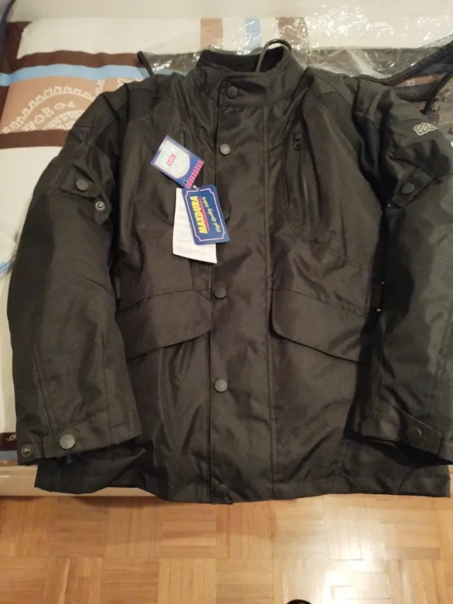 Chaqueta de moto de color negro, con etiquetas. Con refuerzos en espalda codos hombros y antebrazo - Diseño moderno. - Tejido de alta calidad.