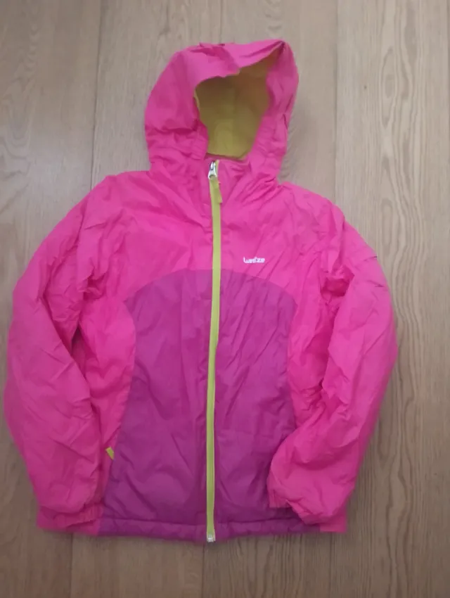 Chaqueta de nieve con capucha, ideal para actividades al aire libre. - Color rosa y fucsia. - Cremallera delantera. - Forro interior amarillo.