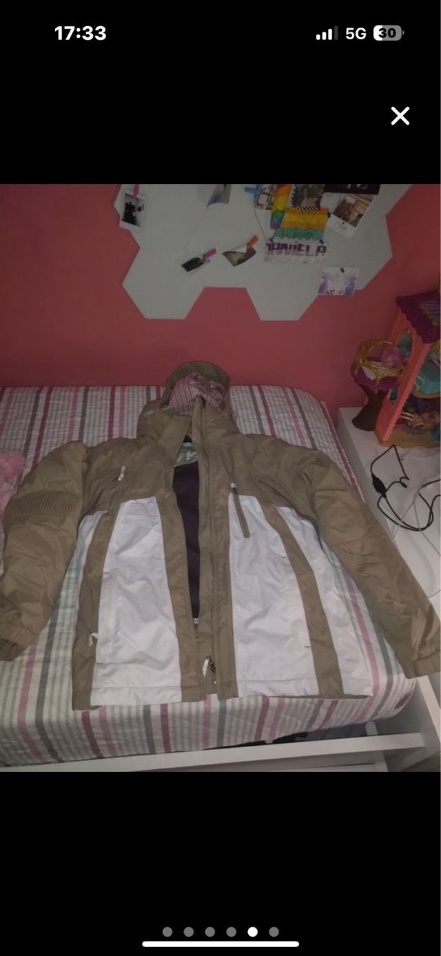 Detalles del productoChaqueta de nieve en color beige y blanco, ideal para actividades al aire libre.