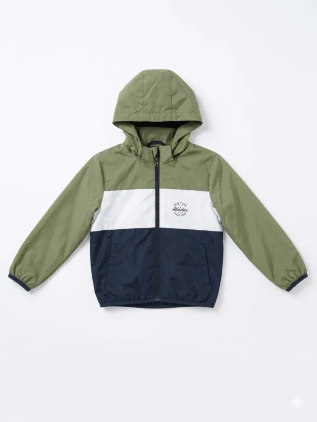 Chaqueta de verano con diseño de bloques de color. - Color verde, blanco y azul marino. - Capucha. - Cierre de cremallera.