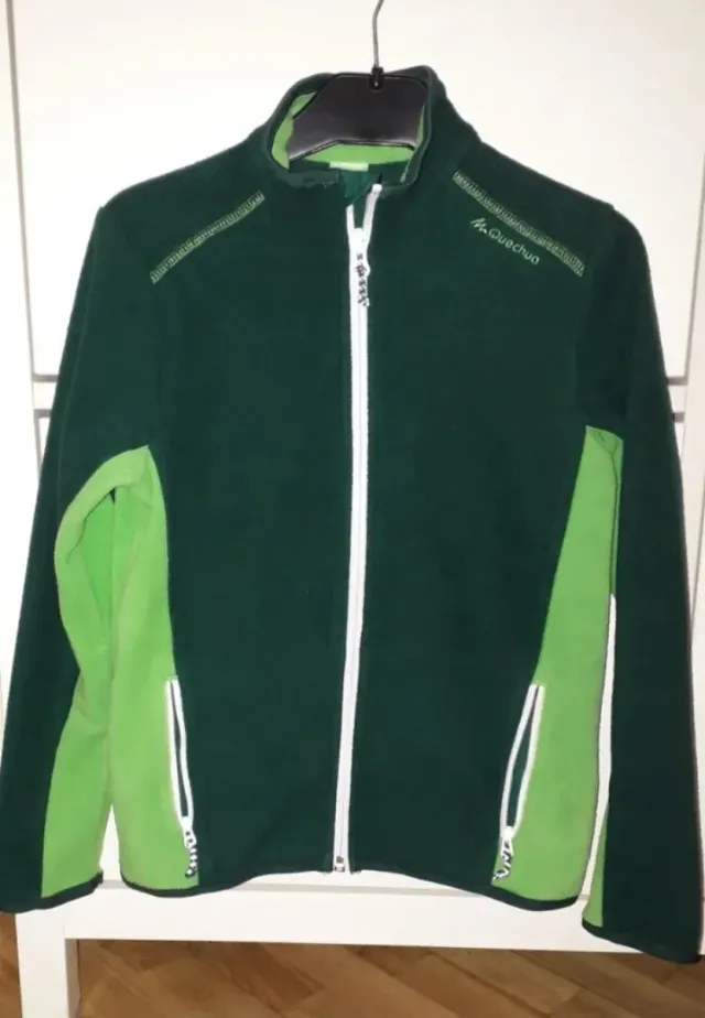 Detalles del productoForro polar con cremallera en tonos verdes, bolsillos también con cremalleras, en perfecto estado. Sudadera ideal para la vuelta al cole. Quechua.