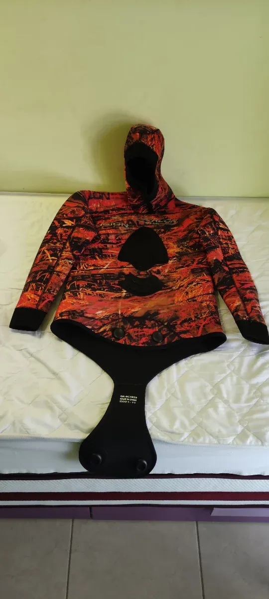 Detalles del productoChaqueta de pesca submarina Epsealon con un diseño camuflado en tonos rojos y naranjas.( Talla 5 para 80-90kg)