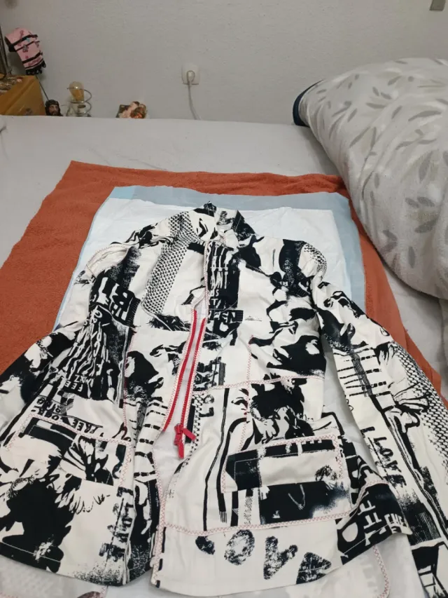 Chaqueta con un llamativo estampado gráfico en blanco y negro. Presenta un diseño moderno y único.