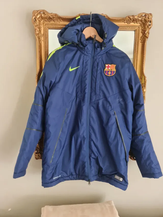 Estado: Muy bueno / Excelente (sin roturas ni enganchones). Tecnología Storm-FIT: Tejido de alta gama totalmente resistente al agua y al viento, ideal para climas fríos o lluvia. Detalles: Escudo del Barça bordado y logo de Nike en color "Volt" (amarillo neón). Corte: Ajuste cómodo, con acolchado térmico para mantener el calor. Capucha protectora y bolsillos con cremallera. Autenticidad: 100% original con etiqueta de autenticidad de Nike Football en el bajo.