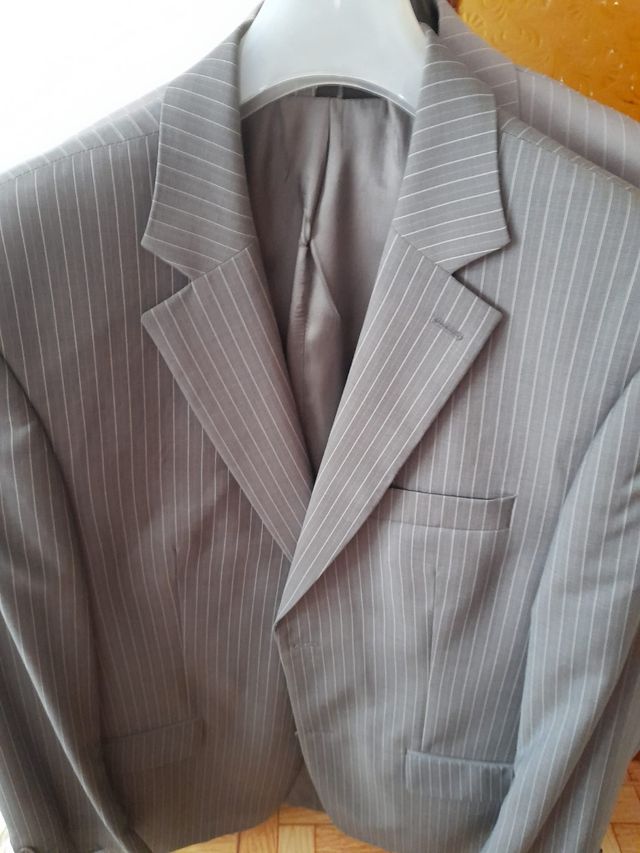 Detalles del productoElegante chaqueta de traje para hombre, a rayas diplomáticas, en color gris. Está en buen estado.