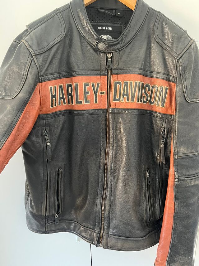Detalles del productoChaqueta de moto Harley-Davidson original de cuero. Color negro con detalles en naranja y logo bordado en la espalda. Talla M-L (Riding Gear). Diseño robusto con cremalleras metálicas, bolsillos delanteros y protecciones en hombros y codos. Interior con forro transpirable. En buen estado general,La chaqueta está gastada por el uso, se aprecia en las fotos, lo que le da un look auténtico y motero.