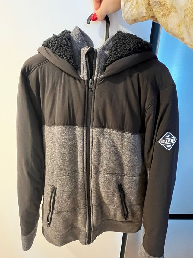 Chaqueta con capucha de la marca Hollister, combinando paneles en negro y gris.