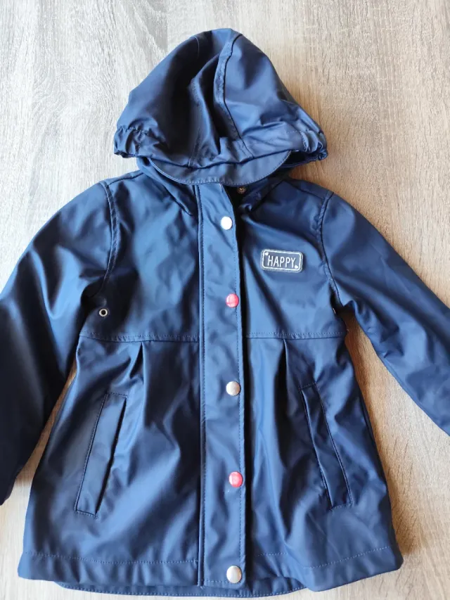 Chaqueta impermeable de color azul para niña, talla 98cm. Ideal para días de lluvia. - Cierre de botones a presión. - Capucha. - Bolsillos laterales.