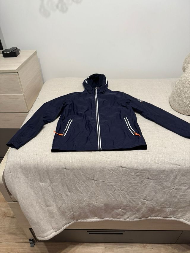 Chaqueta impermeable de color azul marino para niño, talla 11. - Cierre de cremallera. - Capucha. - Bolsillos laterales con cremallera.