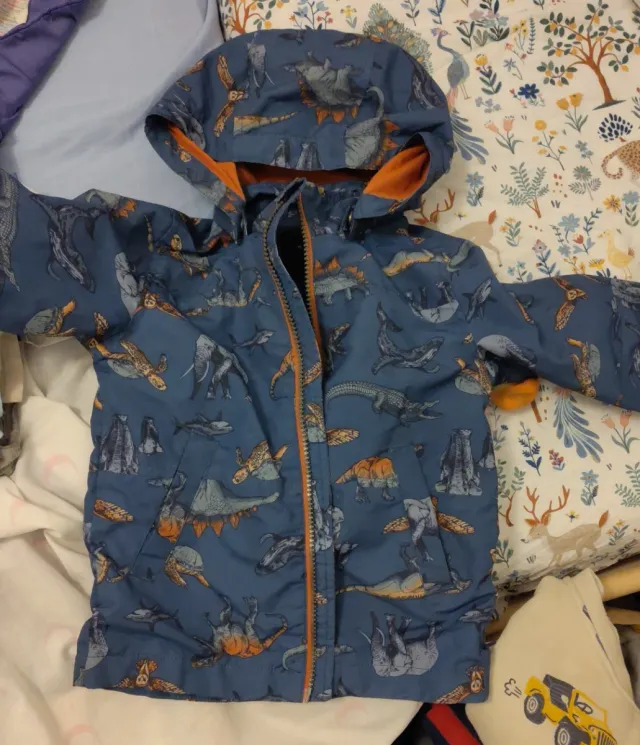 Detalles del productoChaqueta impermeable para niños con un divertido estampado de dinosaurios. El forro interior es de color naranja.