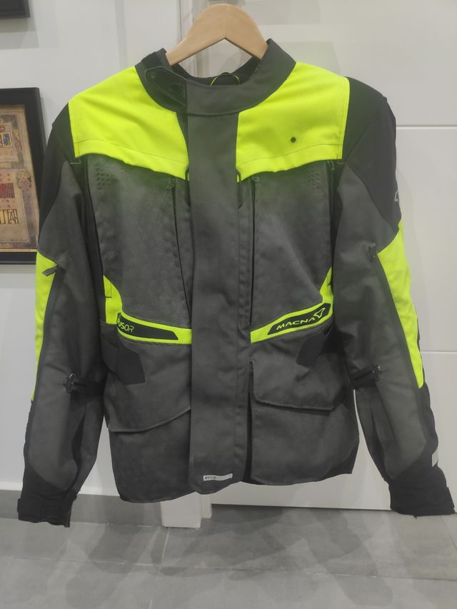 Detalles del productoChaqueta de moto Macna, talla M, en color gris y amarillo flúor.
