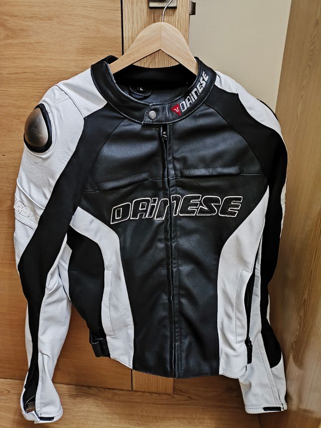 Chaqueta deportiva de moto Dainese de cuero con protecciones en hombros, codos, espalda. Talla L