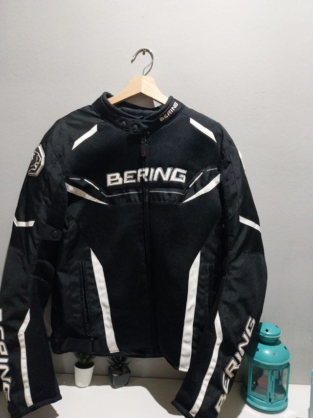 Chaqueta de moto Bering en color negro con detalles blancos. -talla L _protecciones hombros y codos - Diseño deportivo. - Cierre de cremallera frontal. - Cuello alto.
