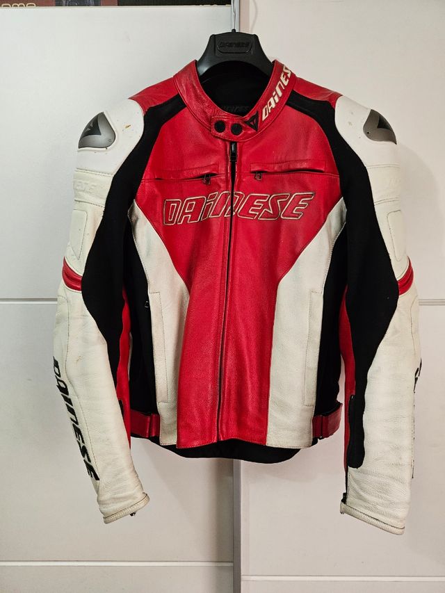 Detalles del productoChaqueta de moto Dainese de cuero, roja y blanca. Está en buen estado, aunque presenta algunas señales de uso.