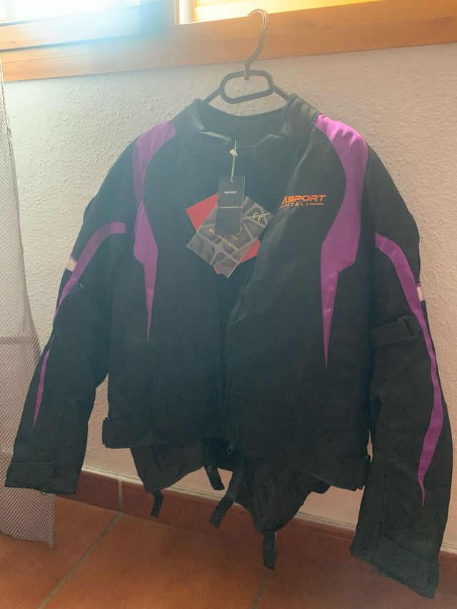 Detalles del productoChaqueta de moto MSport, completamente nueva con etiquetas. Es de color negro y morado, con detalles reflectantes. Con proteccion delantera, traseras y coderas. Chaleco interior para invierno
