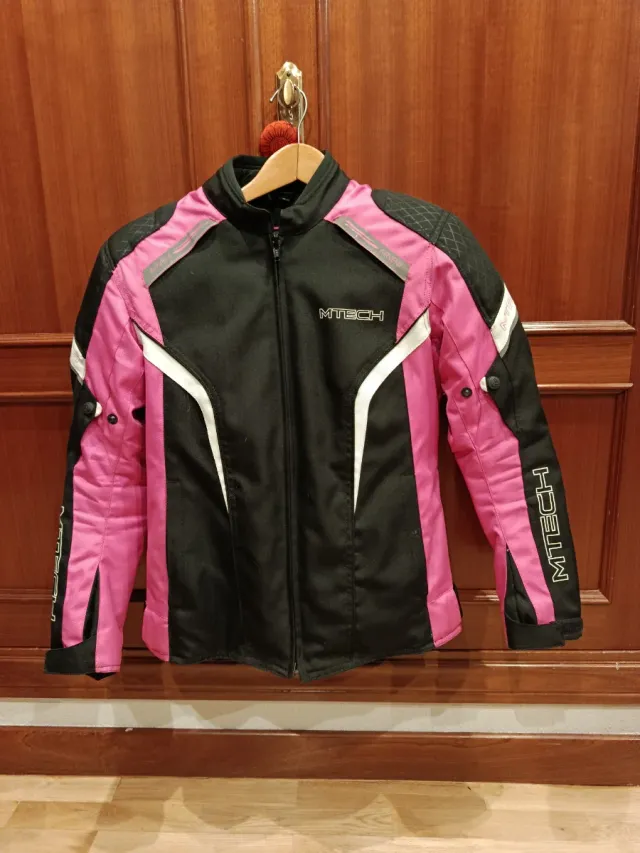 Chaqueta de moto Mtech en color negro y rosa. - Talla S. - Diseño deportivo con detalles reflectantes. - Cierre de cremallera frontal. - Cuello alto.