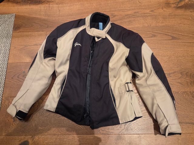 Detalles del productoChaqueta de moto para mujer, talla L, tiene protecciones en hombreras y brazos, se puede instalar una espaldera. Posibilidad de unir al pantalón con cremallera.