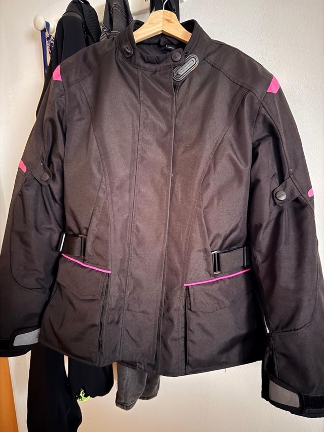 Detalles del productoChaqueta de moto de cordura, talla XL, marca MORE con protecciones en codos y hombros, posibilidad de poner espaldera a medida, negra con detalles en rosa.