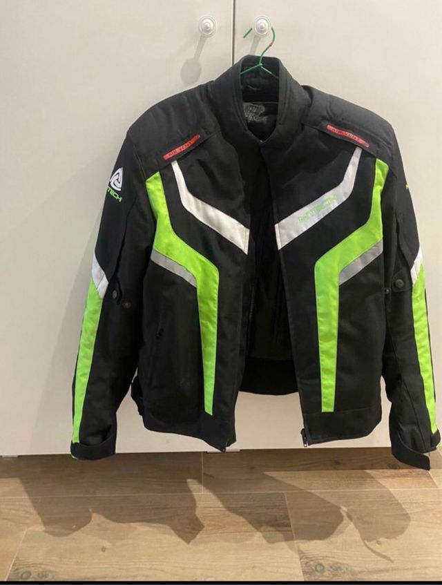 Detalles del productoChaqueta de moto con diseño moderno en negro y detalles en verde lima.