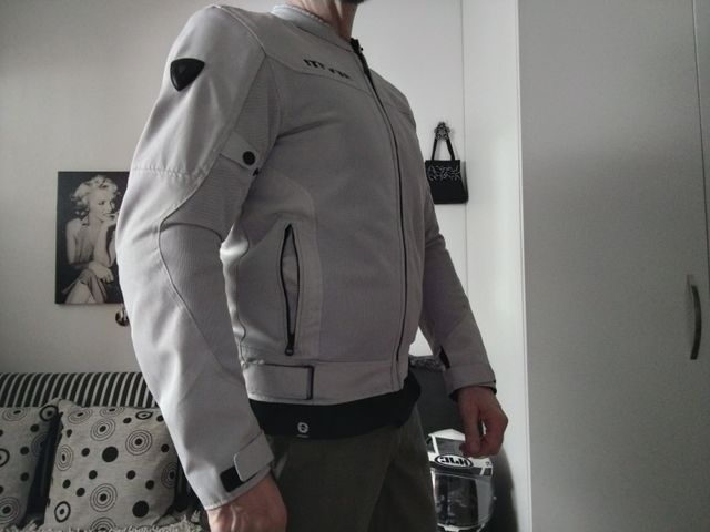 Detalles del productoChaqueta de verano REV'IT!, talla L,en perfecto estado. Es de color gris claro y tiene un diseño elegante y deportivo.