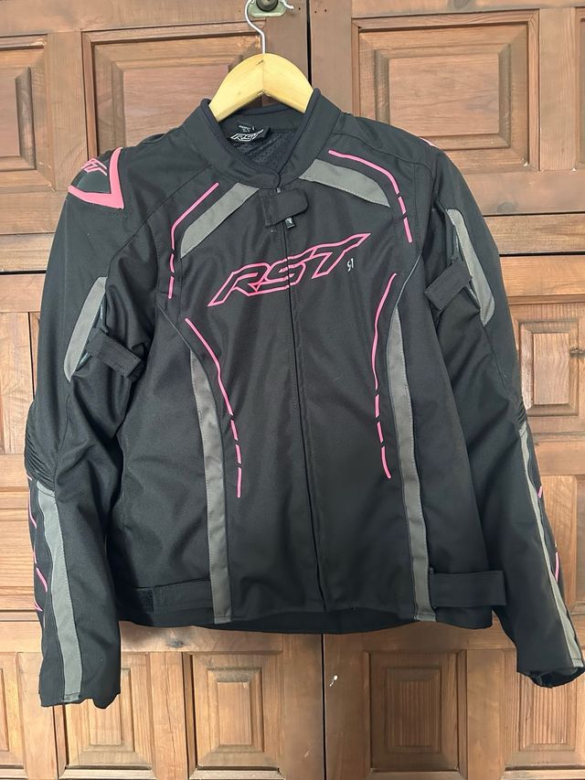 Detalles del productoChaqueta de moto RST para mujer en talla S. Diseño moderno con detalles en rosa y gris.