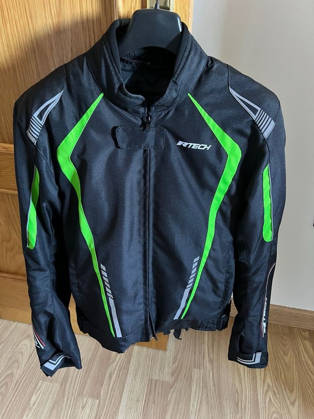 Detalles del productoChaqueta de moto Rtech en color negro con detalles en verde brillante. Diseñada para ofrecer protección y estilo.